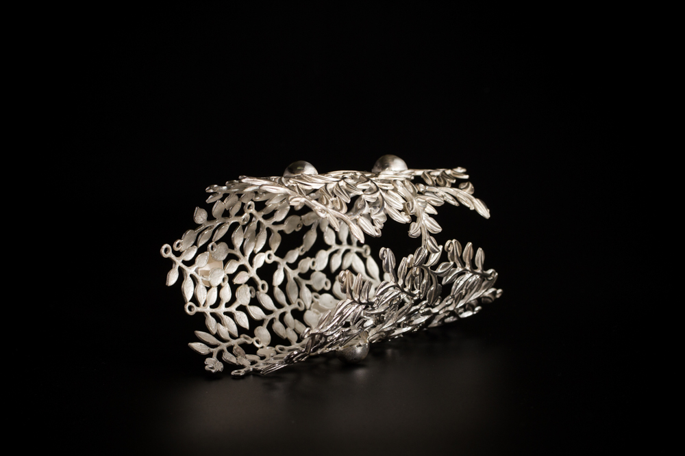 צמיד גדול לאמה המורכב מעלי כסף רבים בשילוב חצאי כדורים